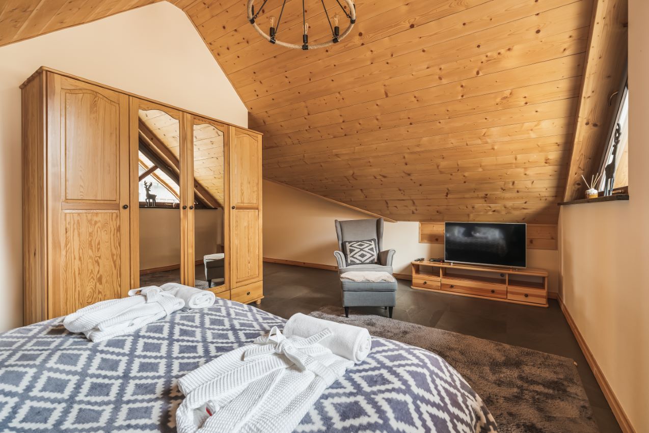 - II zamykanej sypialni z dwoma łózkami pojedynczymi, szafą oraz komodą i TV