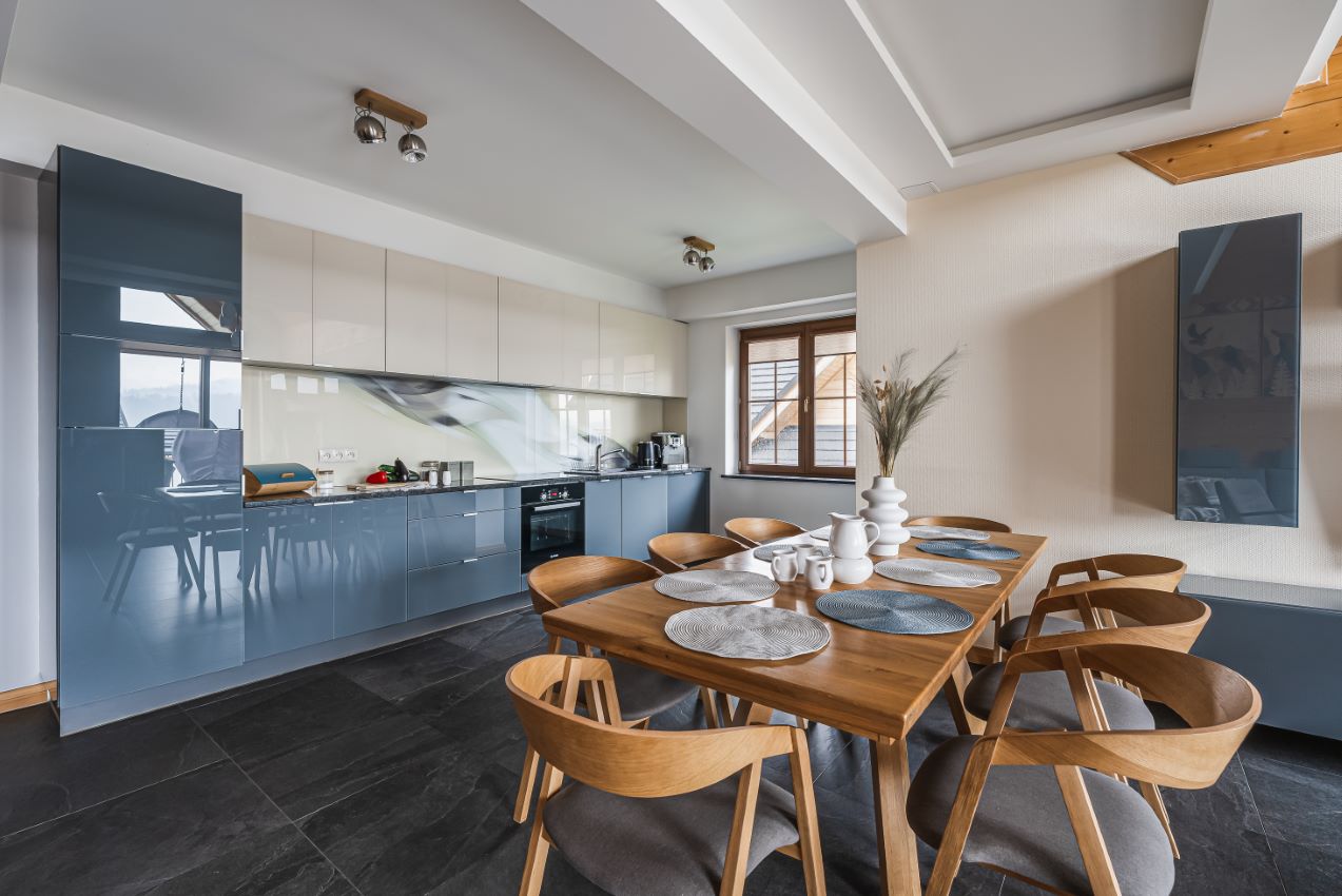 - w pełni wyposażonej kuchni ze zmywarką do naczyń, piekarnikiem, tosterem, mikrofalówką