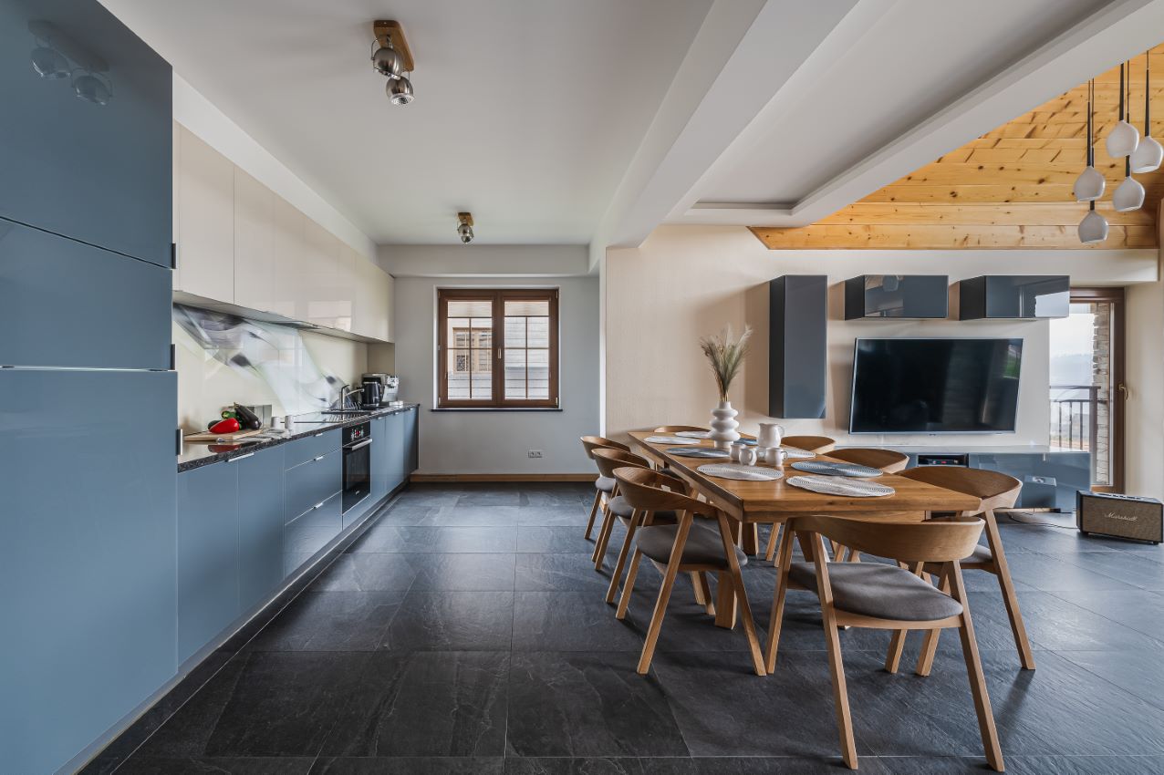Niewątpliwym atutem apartamentu jest taras: słoneczny, przestronny i zadaszony, z którego możemy podziwiać Jezioro Czorsztyńskie z panoramą Tatr.