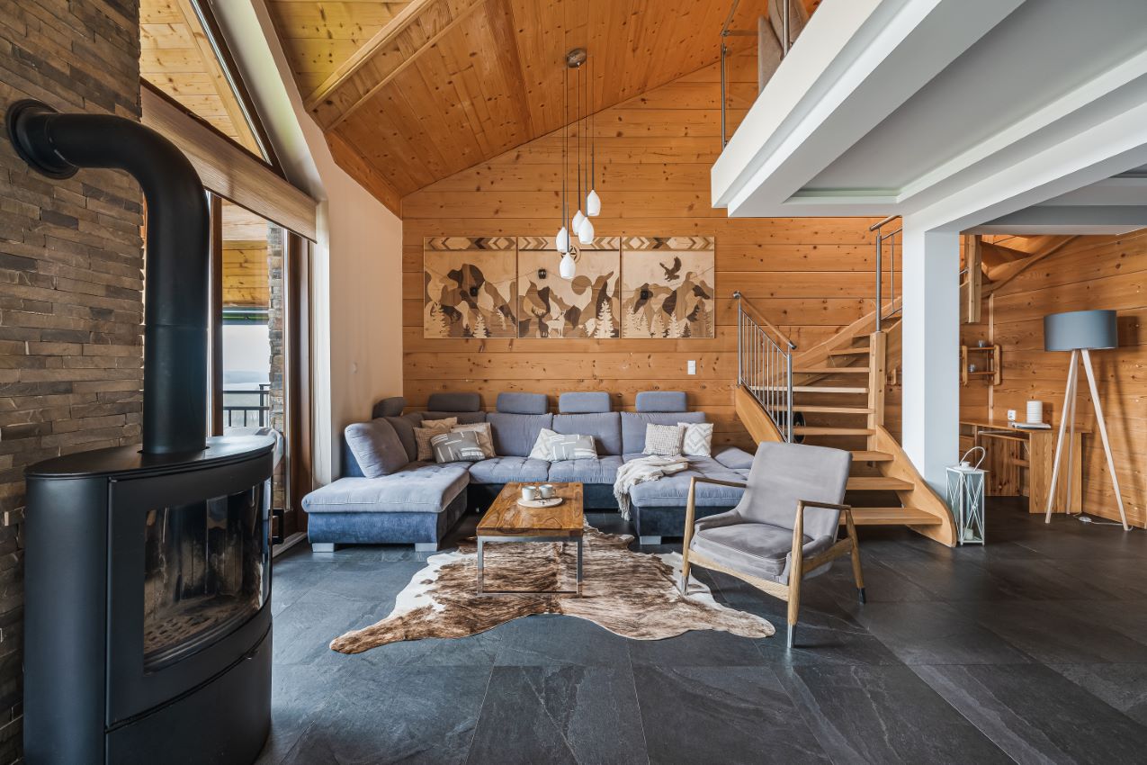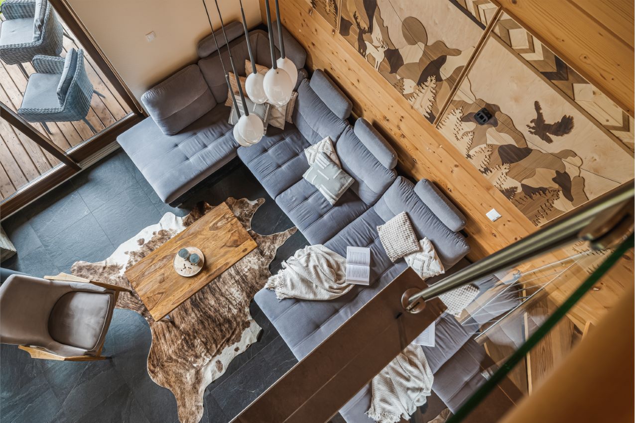- salonu z rozkładanym dwuosobowym narożnikiem, TV oraz kominka typu koza i wyjścia na przestronny balkon z przepięknym widokiem na jezioro