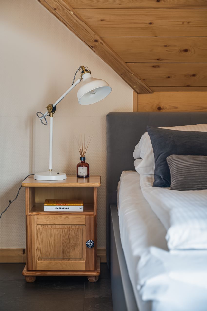 - I zamykanej sypialni z łóżkiem małżeńskim, szafą oraz komodą